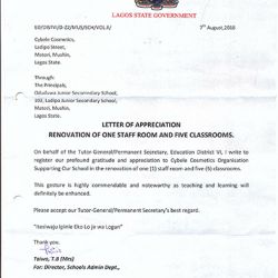 Cybele Cosmetics Limited strongly believe in encouraging education and will continue to explore every available avenue through its corporate social responsibility (CSR) to make learning more comfortable to schools within Mushin Community.