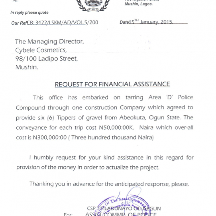 Cybele Cosmetics limited is always at the vanguard when it comes to supporting the Nigeria police in their work of protecting life and property. This was shown in the recent presentation of a sizable cheque to the Assistant Commissioner of police in Area D (Mushin) on the 21st of January 2015 in support of their on-going project at the police station.