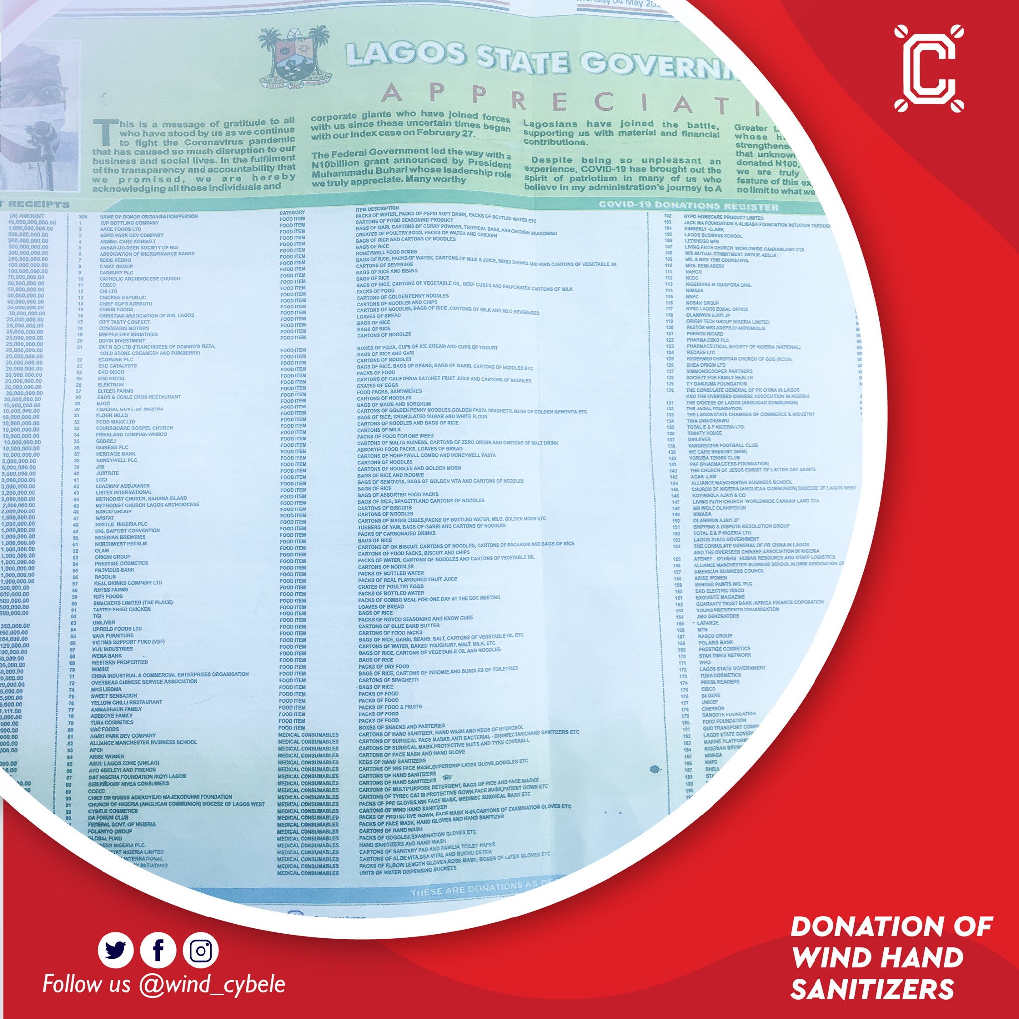 WIND HAND SANITIZER TO LAGOS STATE TASK FORCE